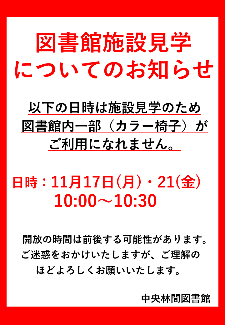 【11月17日(月)・21日(金)館内一部座席の利用制限について】 投稿日: 2025年11月14日 重要 以下の日時は施設見学のため、図書館内一部の座席(カラー椅子)がご利用になれません。 日時:2025年11月17日(月) 10:00~10:30 2025年11月21日(金)10:00~10:30なお開放の時間は前後する可能性があります。ご迷惑をおかけいたしますが、ご理解のほどよろしくお願いいたします。 前の記事 次の記事