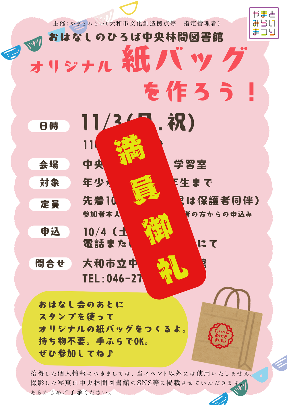 【満員御礼】おはなしのひろば中央林間図書館~オリジナル紙バッグをつくろう!~ 投稿日: 2025年9月27日 お知らせ 本イベントは定員に達したため、受付を終了させていただきます。ありがとうございました。※キャンセル待ちはありませんのでご了承ください。 前の記事 次の記事